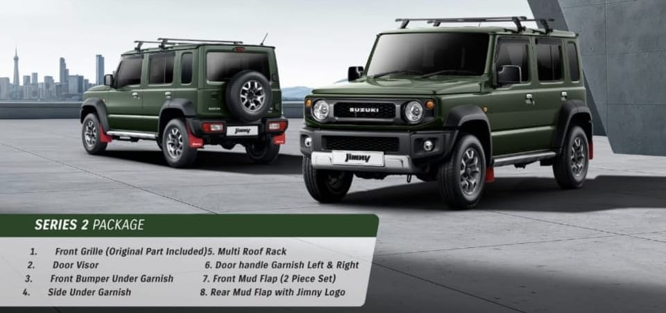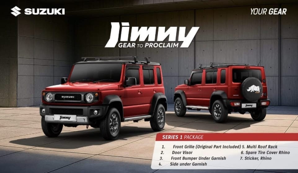 Suzuki menawarkan dua pilihan paket aksesori untuk Suzuki Jimny 5 Doors: Series 1 Package dan Series 2 Package. Keduanya dirancang untuk memenuhi kebutuhan pengguna yang ingin tampil stylish dan adventure-ready.